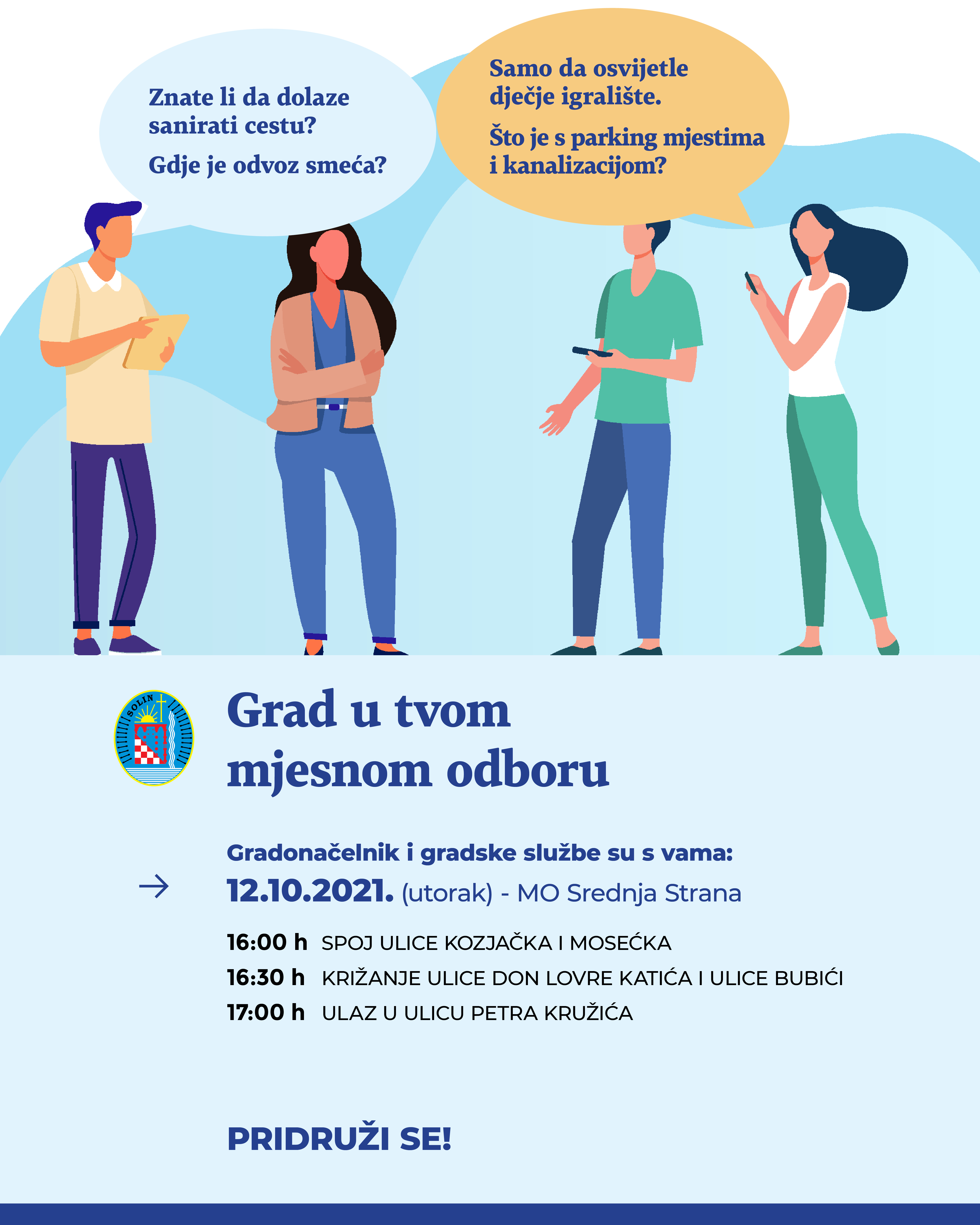 Pozivamo sve građane u mjesnom odboru Srednja Strana da se sutra (utorak), s početkom u 16:00 sati pridruže gradonačelniku i predstavnicima gradskih službi na nekoliko lokacija.