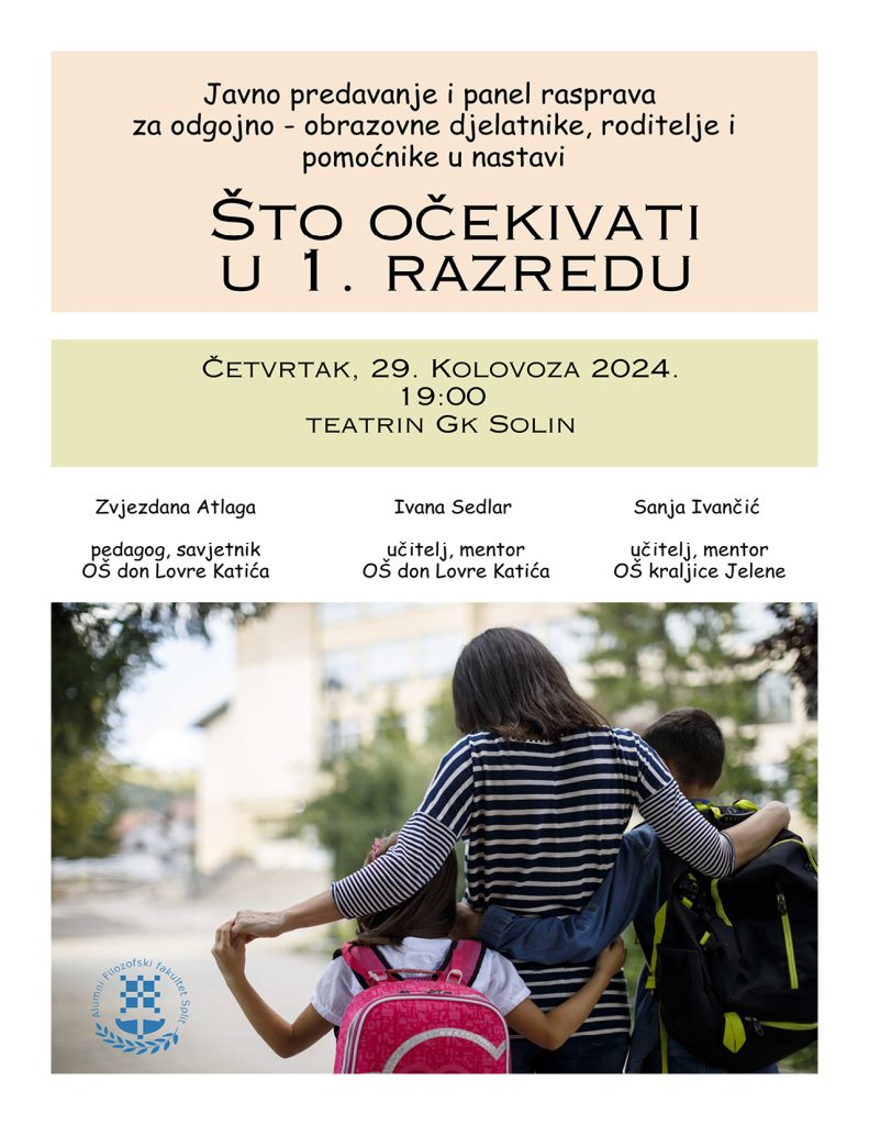 Alumni Filozofskog fakulteta iz Splita organizira u Teatrinu Gradske knjižnice Solin u četvrtak, 29. kolovoza s početkom u 19:00 sati javno predavanje i panel raspravu za roditelje, asistente u nastavi te odgojno – obrazovne djelatnike na temu “Što očekivati u 1. razredu”.