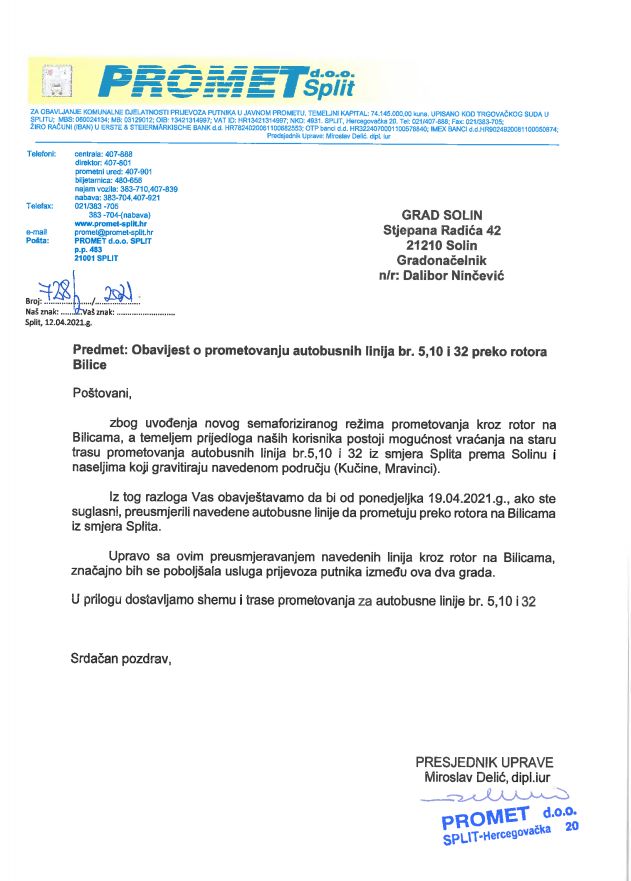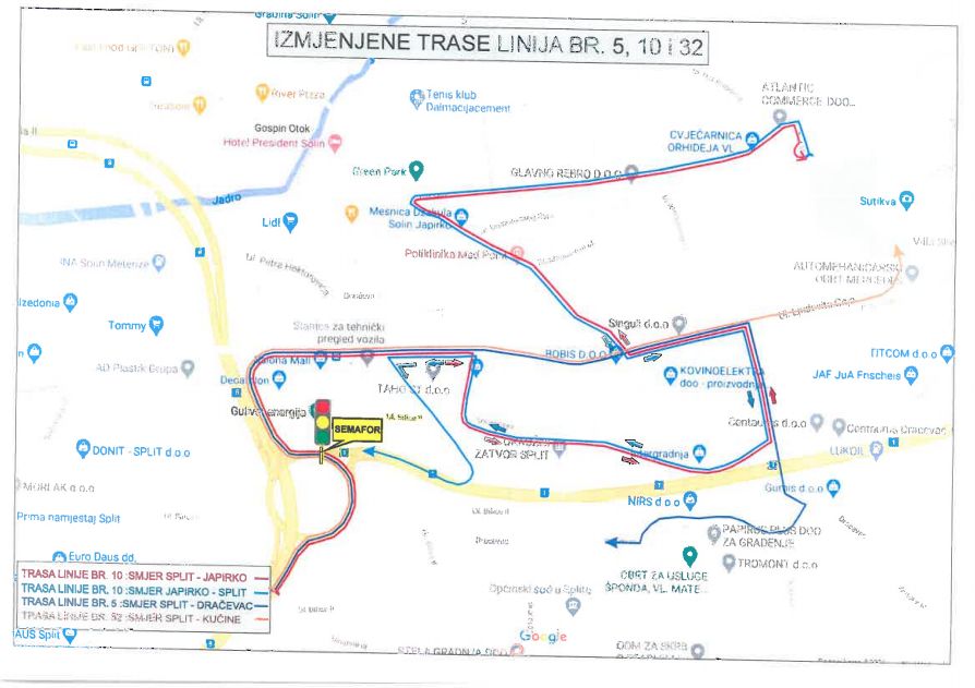 Zbog uređenja novog semaforiziranog režima prometovanja kroz rotor na Bilicama, a temeljem prijedloga korisnika autobusnih linija brojeva 5, 10 i 32, iste se vraćanja na staru trasu prometovanja iz smjera Splita prema Solinu i naseljima koji gravitiraju navedenim područjima, a to su naselja Priko Vode,  Mravince i Kučine.