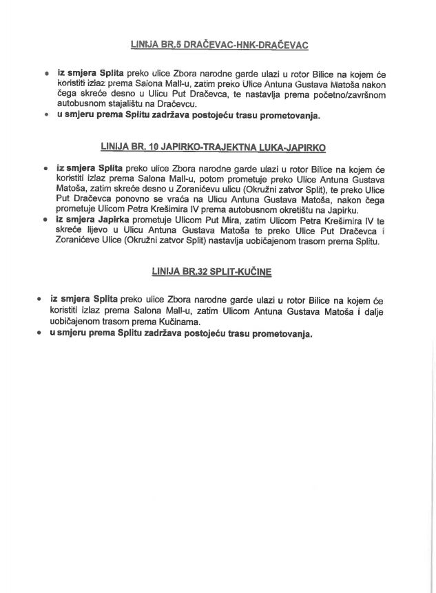 Iz tog razloga Promet Split d.o.o. obavještava da od ponedjeljka 19. travnja 2021. godine preusmjerava navedene autobusne linije da prometuju preko rotora na Bilicama iz smjera Split.