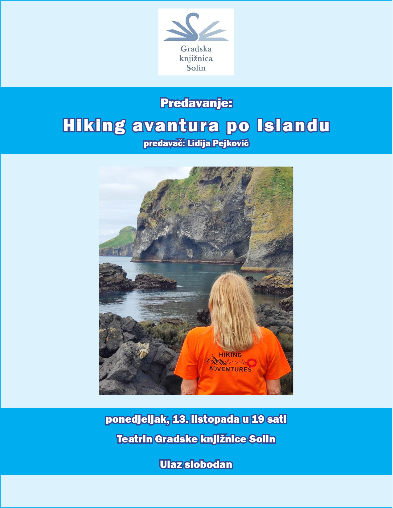 Gradska knjižnica Solin poziva na predavanje „Hiking avantura po Islandu“ kojeg će u ponedjeljak, 13. listopada u 19 sati u Teatrinu GK Solin održati Lidija Pejković. Ona je proteklog ljeta bravila na Islandu dva tjedna i zajedno ga s još 30-ak ljudi iz raznih dijelova Hrvatske obišla uzduž i poprijeko.